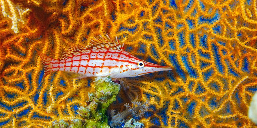 This reef is the most northeastern of the central area of St.John's. It is a steep wall reef that lies between 0 and 4m under water, depending on the season. The reef edge is riddled with grooves, notches and overhangs everywhere. Everywhere you can see beautiful and abundant growth of soft and hard corals as well as very large gorgonians and black corals. Besides the big fan corals you can surely see the favorite of all divers, the longnose hawkfish. In width Habili Ali measures 20 to 25m from north to south, in length from east to west 150 to 200m. In the south it slopes 10 to 15m and then turns into a narrow plateau. The east and west sides drop well over 40m. Unfortunately, the reef can not always be approached, because the reef top is so close to the water that even with a small outer wave quite decent breakers can form. Since Habili Ali is an outer reef, the current can be from weak to very strong and come from all directions. A current test is therefore essential.